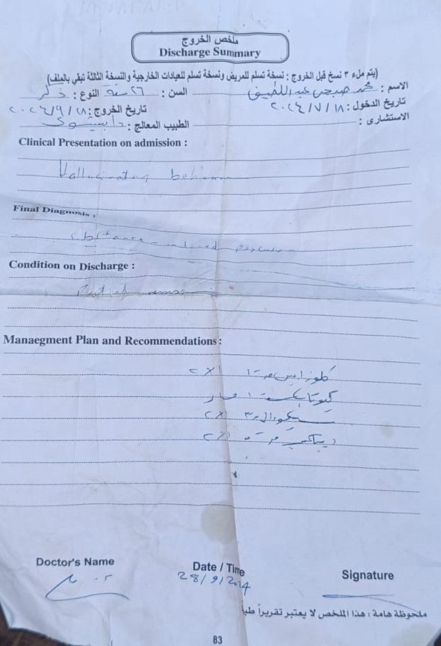 وبعد شهر عادت له الهلاوس مرة أخرى وحالته تدهورت مؤخرًا كثيرا، وأصبح يهاجم أفراد عائلته دون سبب وعادتا ما يتمم بعبارات غريبة وكأنه يتحدث مع أشخاص آخرون ويأمرهم بالجلوس صفا واحدا، ويرفض تناول العلاج تمامًا وتحدث له حالات هياج شديد وتكسير لمحتويات المنزل والسب والشتم إلى أفراد عائلته والتعدي الدائم على والدته المسنه المريضة وشقيقته الصغرى حتى صارت حياتهم جحيم بسبب ما يفعله معهم، ومع غياب استجابة واضحة من الجهات المختصة لنقله إلى مستشفى علاجي، أصبحت الأسرة تعيش في “كابوس يومي” خوفًا من أن ينفذ تهديداته في أي لحظة.