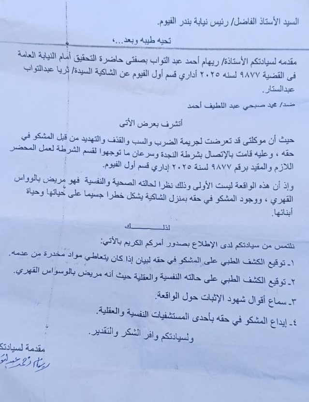 تعيش أسرة من ثلاثة أفراد بحي النويري، بمحافظة الفيوم حالة من الرعب والخوف والقلق الدائمين، بعد أن تحول مرض ابنهم النفسي إلى خطر يهدد حياتهم داخل المنزل، حيث تقدمت الأم ونجلتها الطالبة بكلية التجارة جامعة عين شمس، باستغاثة عاجلة إلى المحامي العام لنيابات الفيوم، مطالبين بسرعة التدخل وتحويل نجلهم الشاب محمد صبحى عبد اللطيف، إلى مستشفى للأمراض النفسية والعبية حفاظًا على حياتهم وحياة جيرانهم، خاصة بعد تكرار تهديده لهم بالقتل في لحظات فقدان السيطرة والتدهور النفسي، حيث قام أمس بخنق شقيقته وسحبها بالقوة إلى البلكونة لإلقائها في الشارع.