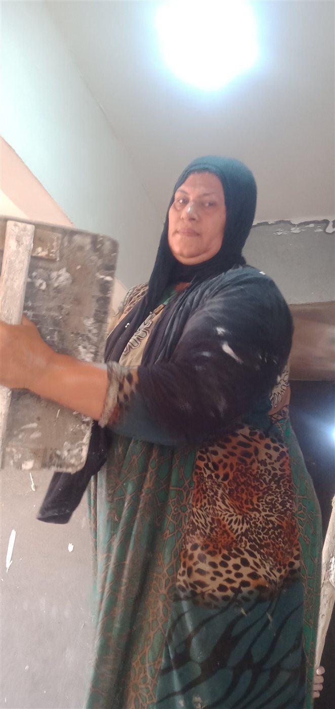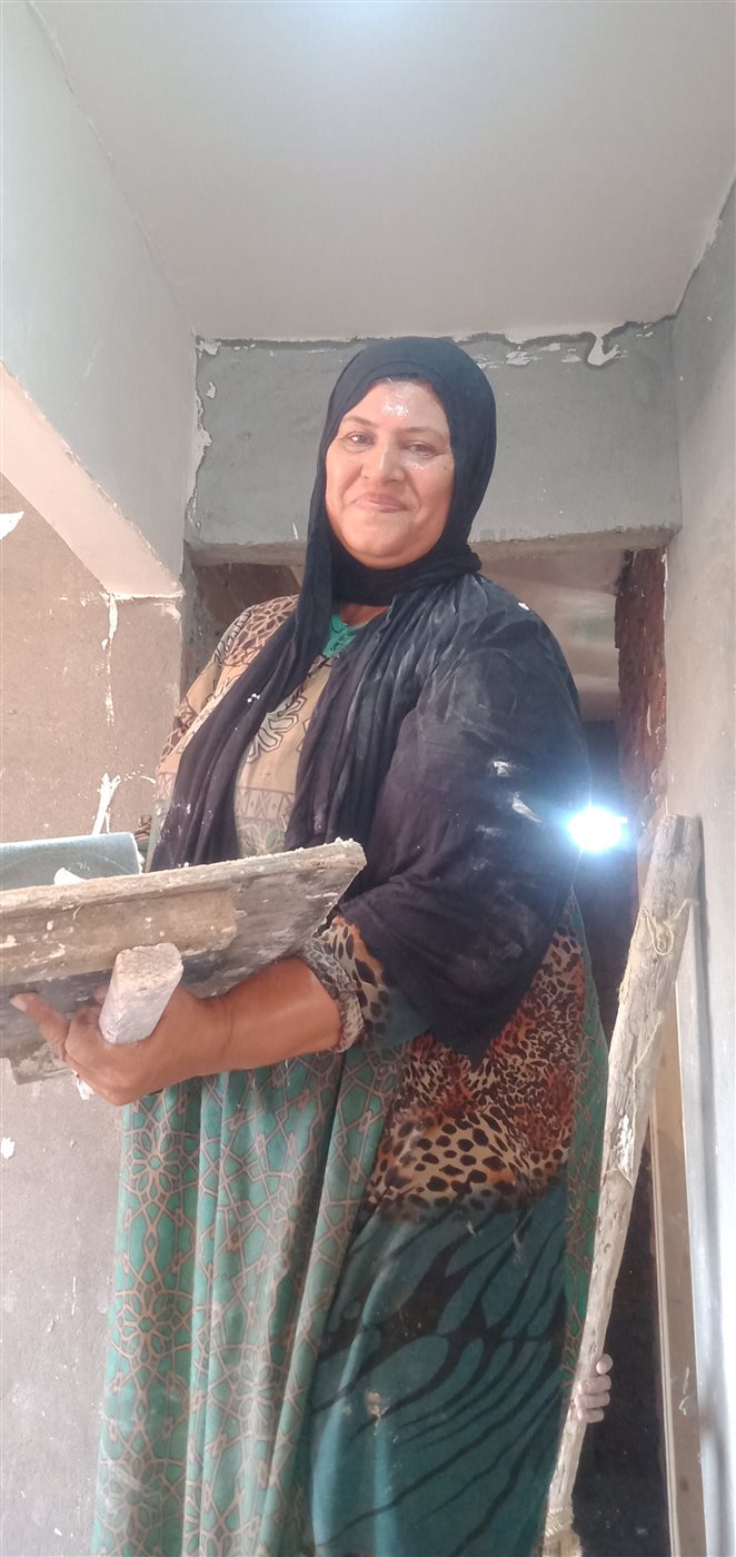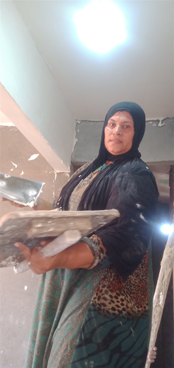 الشقيقتان هويدا عبد الرازق محمد ٥٣ عاما وشربات ٤٨ عاما ظهرتا أثناء أداء عملهما داخل إحدى الشقق السكنية حيث تقمن بأعمال المحارة والجبس وبناء الحجرات بالطوب فضلا عن رفع شكائر الأسمنت والجبس إلى الطوابق العليا وهو ما يعد مهمة شاقة لا يطيقها الكثير من الرجال.