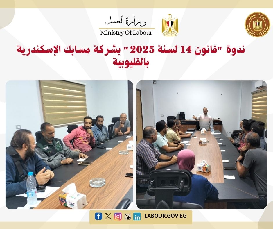 عقدت مديرية العمل بالقليوبية ندوة تثقيفية بعنوان "قانون 14 لسنة 2025" بشركة مسابك الإسكندرية لعدد (12) عاملاً. وأوضح فوزي صابر مدير المديرية أن المحاضرون تناولوا محاور أساسية من القانون، مثل: عقد العمل المكتوب، الإجازات السنوية والرسمية، صندوق تمويل التدريب والتأهيل، الحد الأدنى للأجور، وتشغيل ذوي الهمم. وأوضح تأتي الندوة تنفيذاً لتوجيهات وزير العمل محمد جبران لرفع وعي العمال وأصحاب الأعمال.