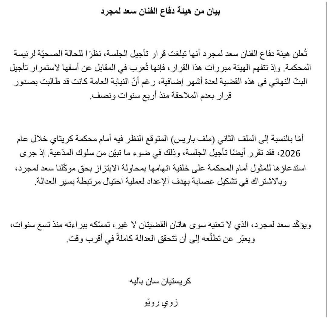 ونشرت الصفحة الرسمية لـ سعد لمجرد، عبر انستجرام، بيانا مفاده: «تعلن هيئة دفاع الفنان سعد لمجرد أنها تبلغت قرار تأجيل الجلسة، نظرًا للحالة الصحية لرئيسة المحكمة. وإذ تتفهم الهيئة مبررات هذا القرار، فإنها تُعرب في المقابل عن أسفها لاستمرار تأجيل البت النهائي في هذه القضية لعدة أشهر إضافية، رغم أن النيابة العامة كانت قد طالبت بصدور قرار بعدم الملاحقة منذ أربع سنوات ونصف».