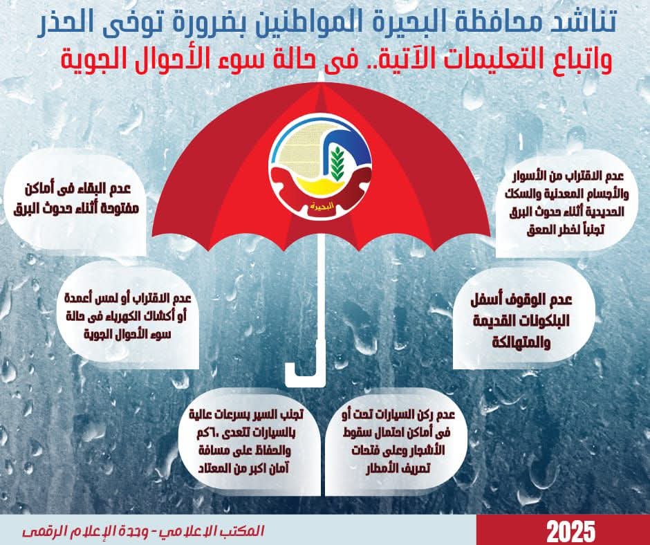 وأكدت محافظ البحيرة على استمرار حالة الجاهزية والاستنفار التام، والتواجد الميداني المستمر للأجهزة التنفيذية، مع تمركز المعدات والآلات وسرعة الاستجابة لأي بلاغات أو مطالب للمواطنين، خاصةً ما يتعلق بسوء حالة الطقس وتجمعات مياه الأمطار.