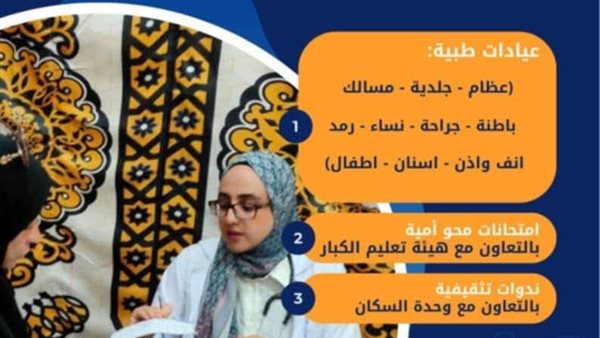 كما تشمل القافلة إجراء امتحانات محو الأمية بالتعاون مع هيئة تعليم الكبار بمحافظة السويس، بالإضافة إلى عقد عدة ندوات تثقيفية بالتعاون مع وحدة السكان بمحافظة السويس، وأنشطة أخرى متنوعة.