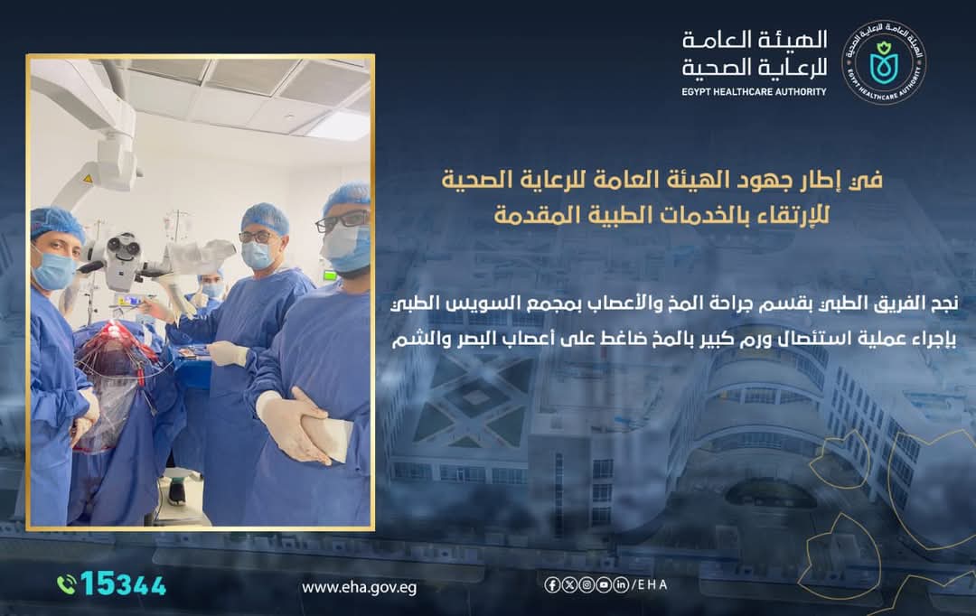 حقق مجمع السويس الطبي إنجازًا طبيًا جديدًا يُضاف إلى سجل نجاحاته، حيث نجح فريق قسم جراحة المخ والأعصاب في استئصال ورم كبير بالمخ كان ضاغطًا على أعصاب البصر والشم، في عملية دقيقة ومعقدة تتطلب خبرة عالية وتركيزًا بالغًا.