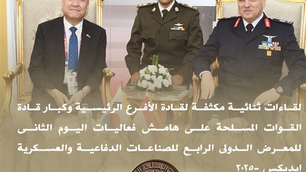 في إطار حرص القوات المسلحة على دعم وتعزيز علاقات التعاون العسكري مع القوات المسلحة للدول الصديقة والشقيقة، وعلى هامش فعاليات اليوم الثاني للمعرض الدولي الرابع للصناعات الدفاعية "إيديكس – 2025"، تم عقد عدد من اللقاءات الثنائية لقادة الأفرع الرئيسية وكبار قادة القوات المسلحة مع عدد من القادة العسكريين وممثلي كبرى الشركات العالمية المتخصصة في مجالات الصناعات الدفاعية.