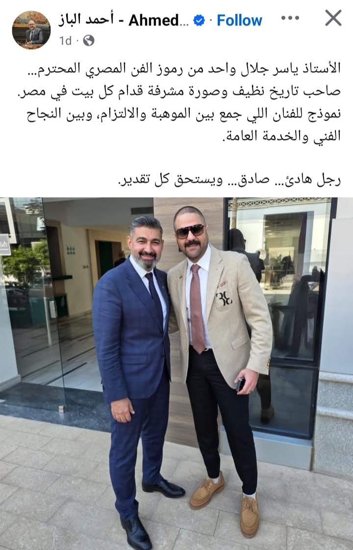 ونشر الباز صورة تجمعه بالفنان ياسر جلال، معلقا عليها في منشور عبر موقع التواصل الاجتماعي فيسبوك: «الأستاذ ياسر جلال واحد من رموز الفن المصري المحترم… صاحب تاريخ نظيف وصورة مشرفة قدام كل بيت في مصر».