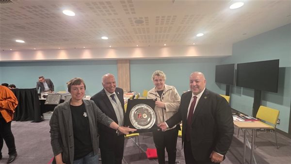 وفي ختام اللقاء، قام خلف الزناتي بإهداء السيدة مايكى فنيرين رئيسة الاتحاد الألمانى للتعليم ، درعاً تذكارياً يحمل شعار نقابة المهن التعليمية، مثمنا التعاون بين نقابة المعلمين المصرية مع الجانب الألماني .