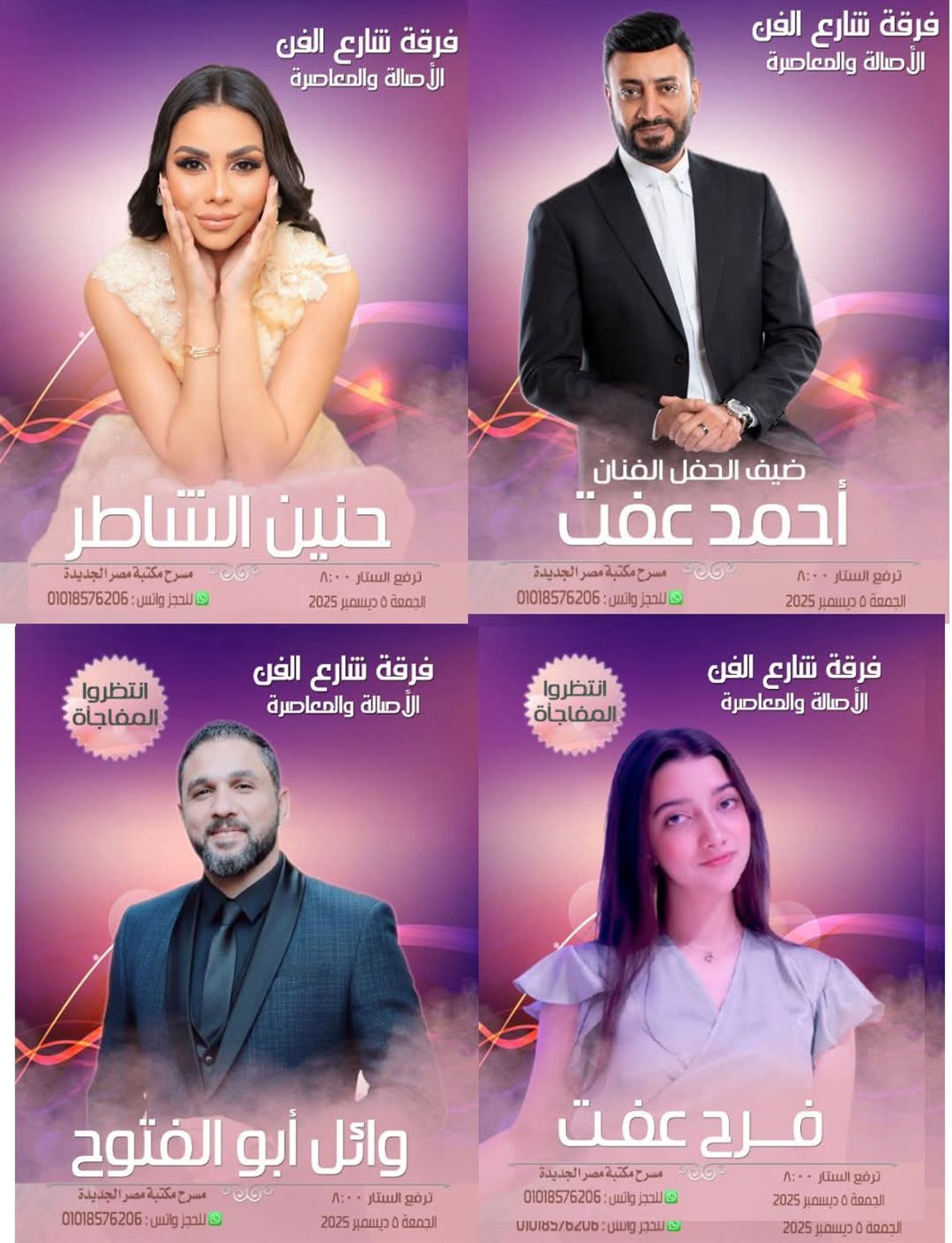 تقيم فرقة شارع الفن حفلاً غنائية بعنوان " الأصالة والمعاصرة" غدا الجمعة الموافق 5 ديسمبر بمكتبة مصر الجديدة، يحييها كل من الفنان أحمد عفت والفنانة حنين الشاطر والفنانة فرح عفت والفنان وائل أبو الفتوح تحت قيادة المايسترو إيهاب عبدالحميد .