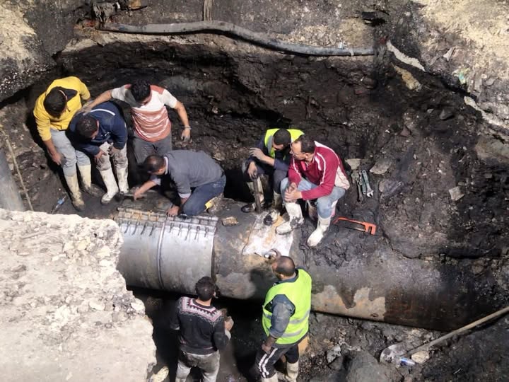 عودة المياه بعد إصلاح كسر خط المياه قطر 1000 مم أمام مستشفى أم المصريين