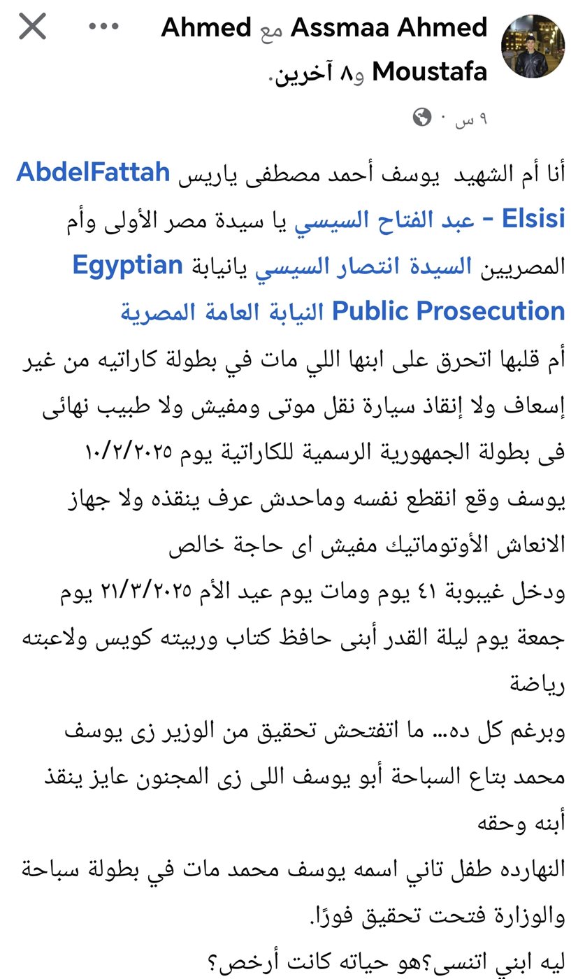واختتمت والدة لاعب الكاراتيه الراحل يوسف أحمد رسالتها قائلة: أنا أم موجوعة… وبستغيث بالرئيس وبكل مسؤول في مصر.. حق ابني مش هيعود، لكن حقه لازم يجي عشان ماحدش يعيش ناري.