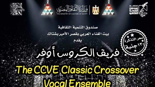 يستضيف بيت الغناء العربي بقصر الأمير بشتاك بشارع المعز أمسية غنائية لفرقة The CCVE – Classic Crossover Vocal Ensemble وذلك في تمام الثامنة مساء غداً (الجمعة 5 ديسمبر)، ويأتي ذلك في إطار استراتيجية صندوق التنمية الثقافية الهادفة إلى إتاحة تجارب فنية متنوعة، ودعم الفرق الشابة والمواهب الواعدة في مختلف مجالات الفنون.