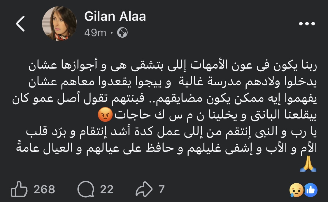 وقالت جيلان علاء في منشورها: “ربنا يكون فى عون الأمهات إللى بتشقى هى و أجوازها عشان يدخلوا ولادهم مدرسة غالية و ييجوا يقعدوا معاهم عشان يفهموا إيه ممكن يكون مضايقهم.. فبنتهم تقول أصل عمو كان …. يا رب و النبى إنتقم من إللى عمل كدة أشد إنتقام و برّد قلب الأم و الأب و إشفى غليلهم و حافظ على عيالهم و العيال عامةً”.