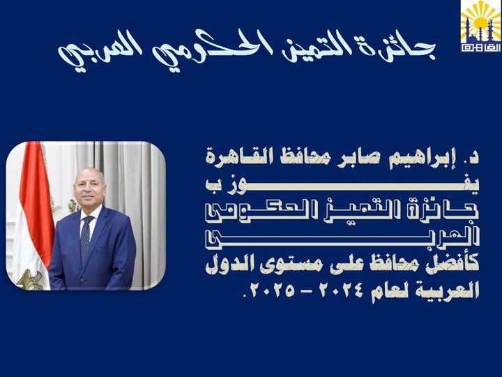فاز الدكتور إبراهيم صابر محافظ القاهرة بجائزة التميز الحكومى العربى في دورتها الرابعة ٢٠٢٤- ٢٠٢٥ كأفضل محافظ على مستوى العالم العربي عن الإنجازات والنجاحات التي حققها خلال توليه منصب محافظ القاهرة.