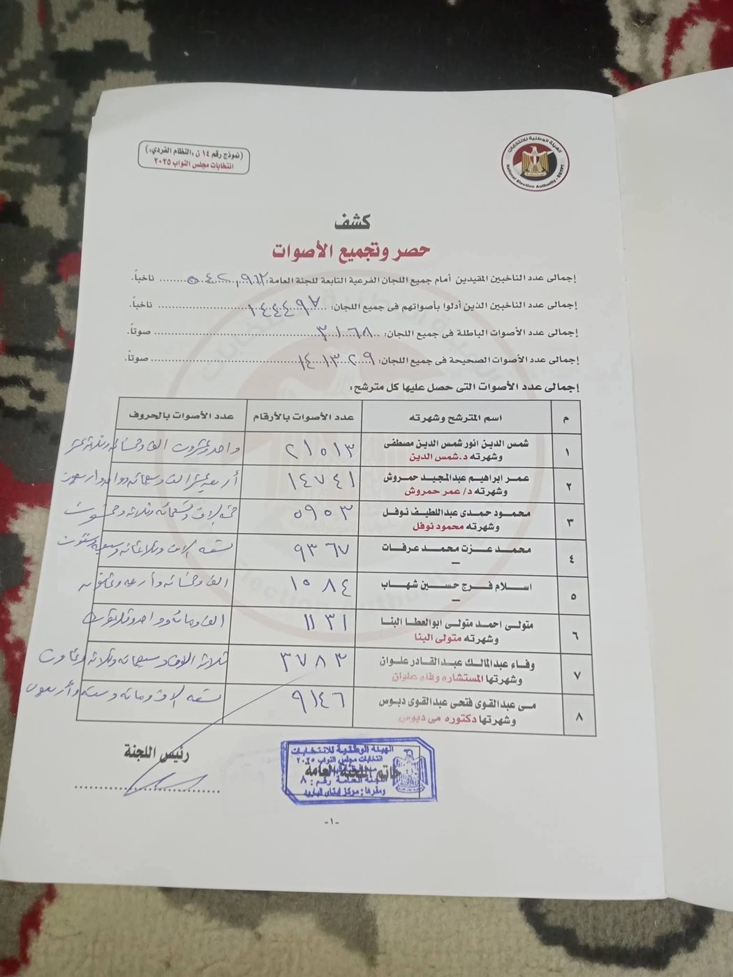منها ٦١٣٥ صوتا باطلا؛ ليكون إجمالى الأصوات الصحيحة ١١٢٥٧١ ألف صوت.