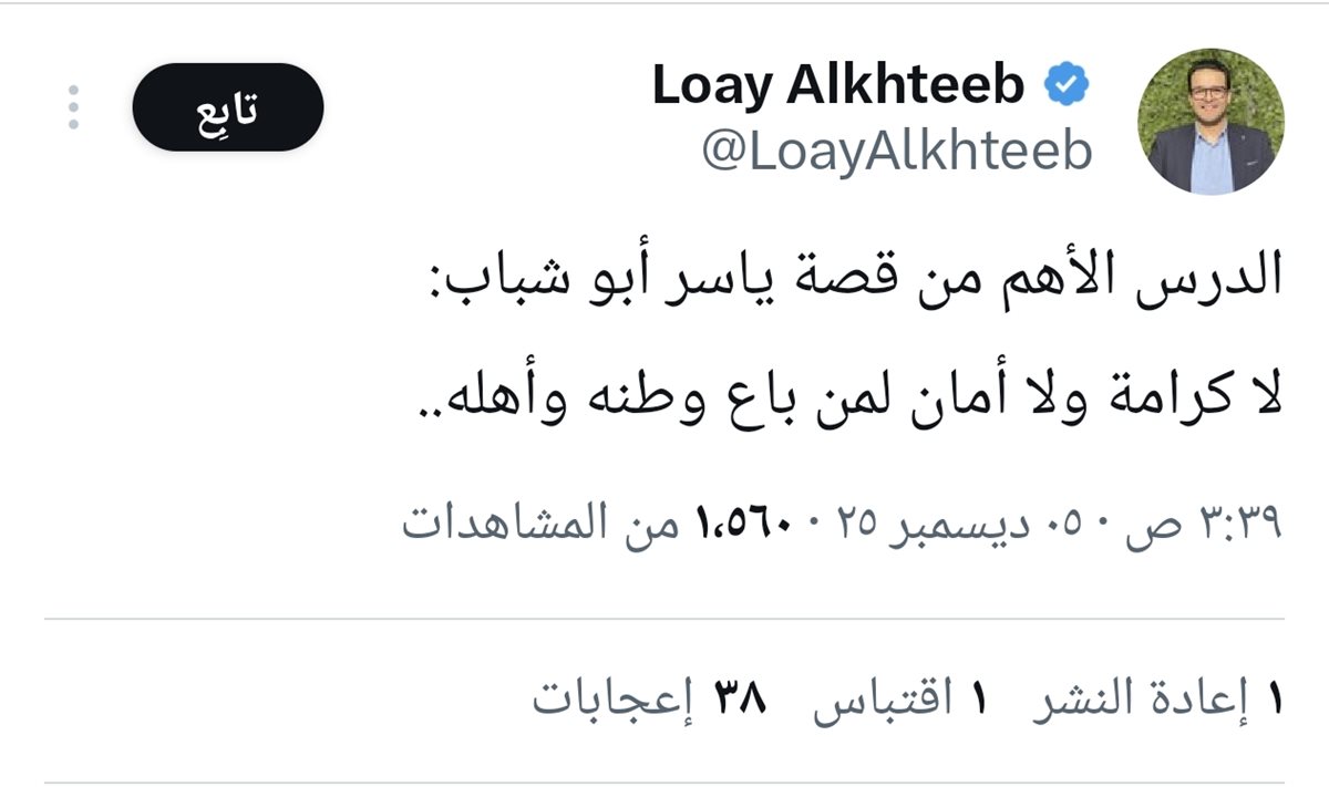 وكتب الخطيب في تغريدة له عبر حسابه على منصة إكس: الدرس الأهم من قصة ياسر أبو شباب، أنه لا كرامة ولا أمان لمن باع وطنه وأهله.
