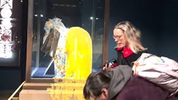 أظهرت لقطات نشرتها الجماعة أحد المتظاهرين وهو يضرب صندوق العرض بفتات التفاح من صينية كبيرة، فيما سكب آخر عبوة كاسترد على واجهة الزجاج.