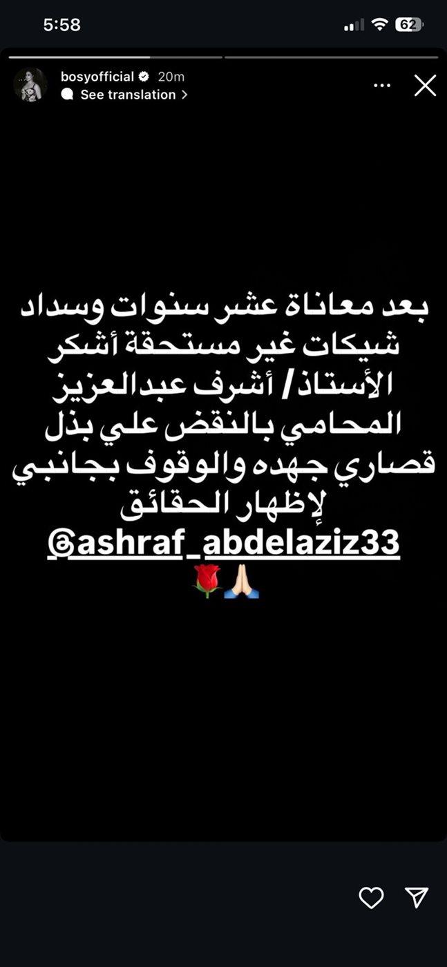 وكتبت "بوسي" عبر حسابها على موقع اسنتجرام: بعد معاناة عشر سنوات وسداد شيكات غير مستحقة، أشكر أشرف عبد العزيز، المحامي بالنقض، على بذل قصارى جهده، والوقوف بجانبي لإظهار الحقائق.