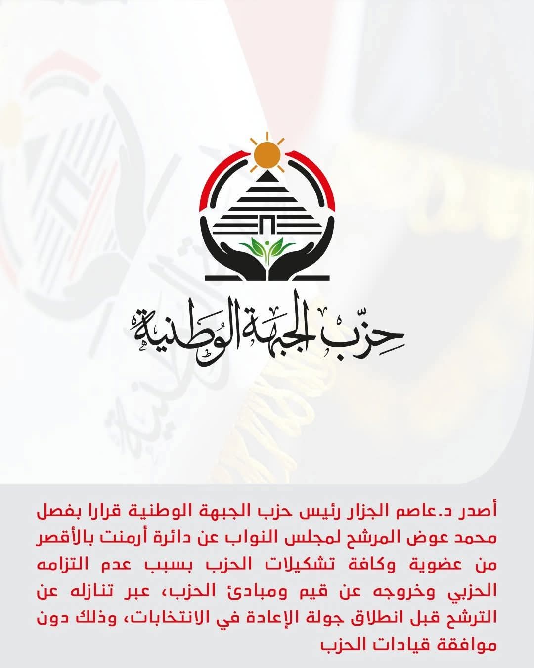 أعلن الدكتور عاصم الجزار، رئيس حزب الجبهة الوطنية، فصل المرشح محمد عوض—المرشح السابق عن دائرة أرمنت – القرنة—من عضوية الحزب وكافة تشكيلاته التنظيمية.