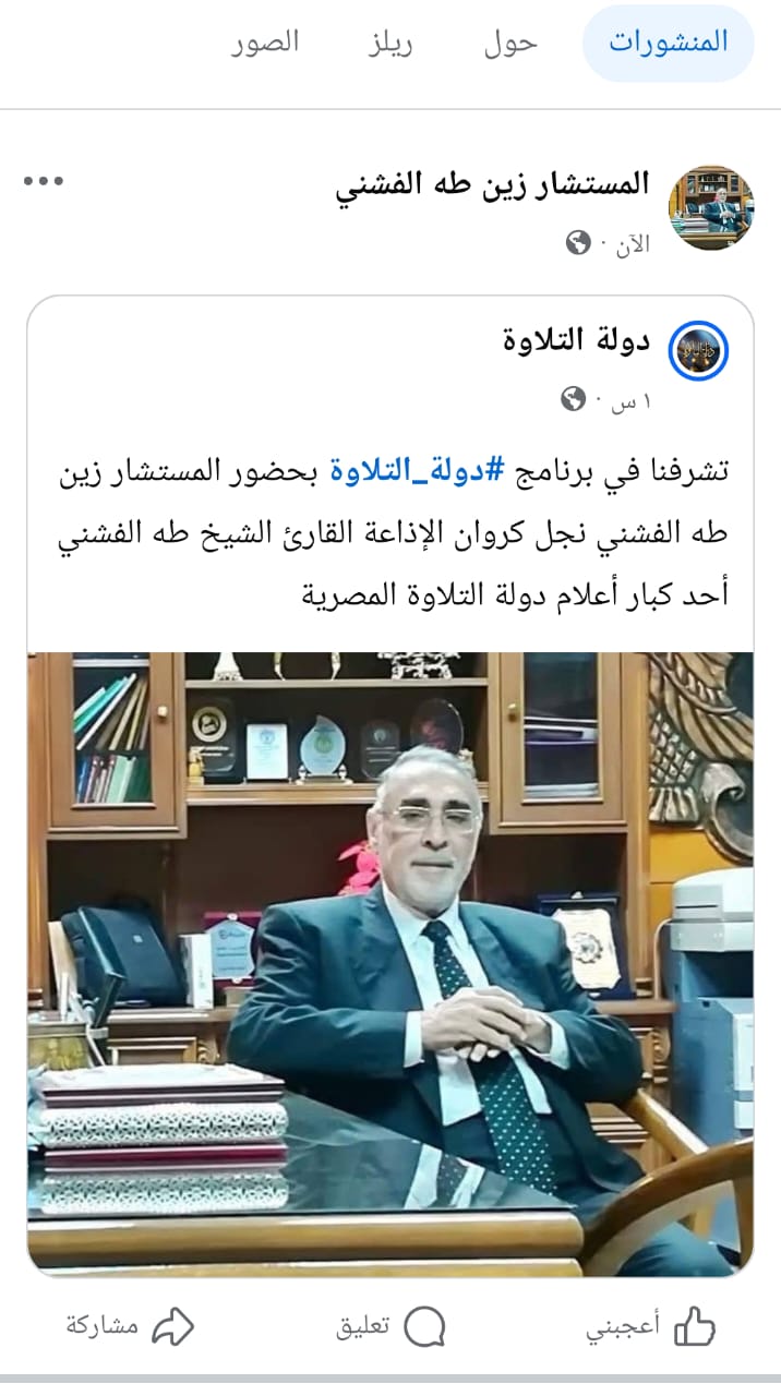 وجاء ذلك من خلال مشاركة "زين الفشني" منشورًا لصفحة برنامج دولة التلاوة تضمن رسالة ترحيب به، جاء فيه: "تشرفنا في برنامج دولة التلاوة بحضور المستشار زين طه الفشني نجل كروان الإذاعة القارئ الشيخ طه الفشني أحد كبار أعلام دولة التلاوة المصرية".