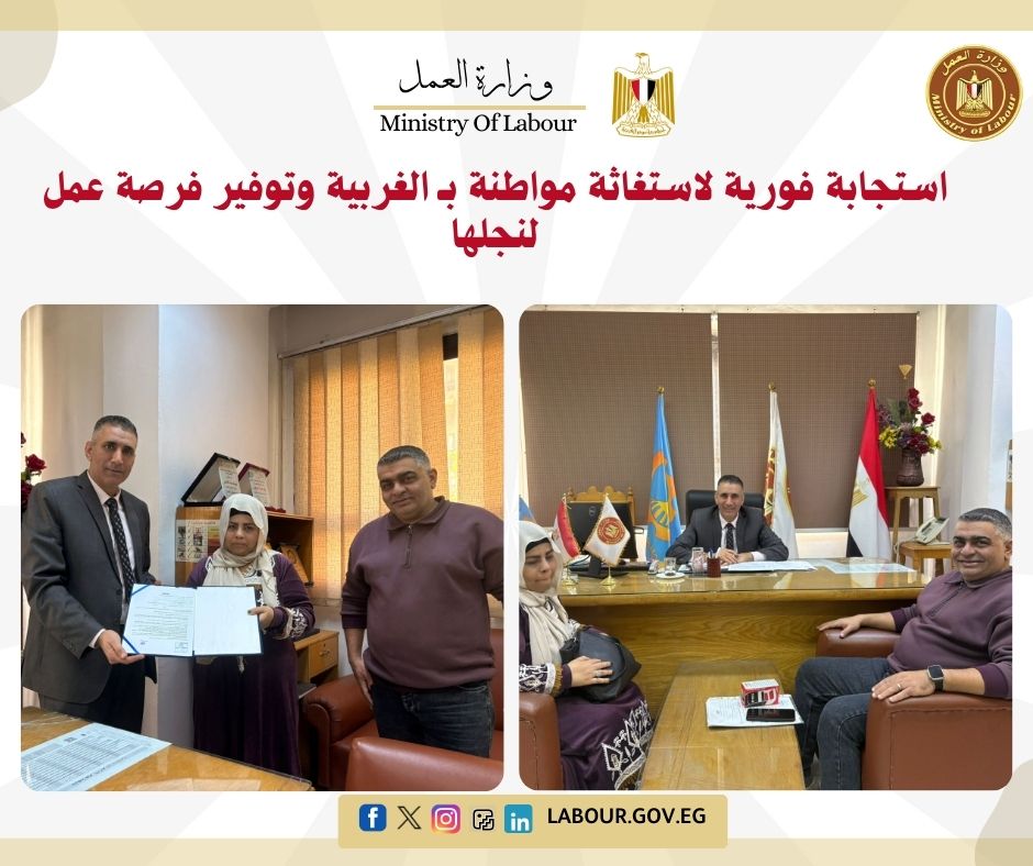 بناءً على تعليمات وزير العمل محمد جبران، وتوجيهات محافظ الغربية، وجّه المهندس نهاد عبدالمعطي وكيل وزارة العمل بالغربية باستجابة فورية لاستغاثة السيدة صبرين إبراهيم محمد لتوفير فرصة عمل لنجلها. تحركت الجهات المختصة بالمديرية لمعاينة الحالة ميدانيًا، وتم توفير فرصة عمل للنجل في مطعم منعم، وقام وكيل الوزارة بتسليم عقد العمل للسيدة رسميًا لدعم الحالات الإنسانية والأولى بالرعاية.