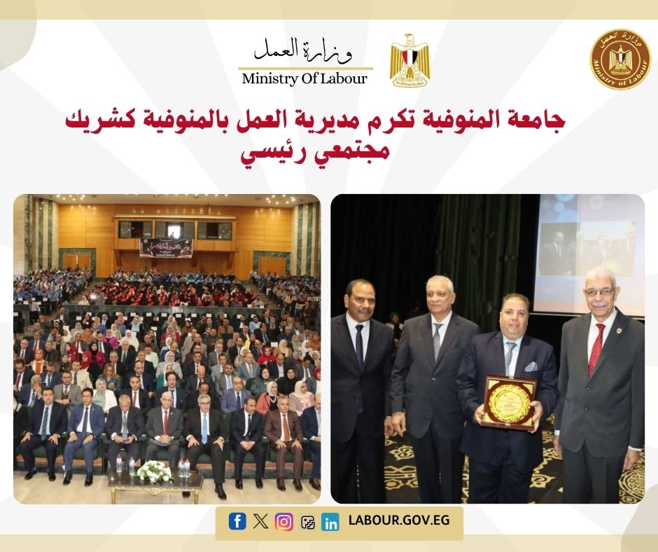 كرّم رئيس جامعة المنوفية مديرية العمل بالمنوفية، ممثلة في مديرها عماد سعيد، خلال مؤتمر قطاع خدمة المجتمع وتنمية البيئة. جاء التكريم نظراً لاعتبار المديرية من الشركاء المجتمعيين الرئيسيين للجامعة، وخاصة في مجال التدريب المهني (الوحدة المتنقلة وريادة المرأة المعيلة)، وتنظيم ملتقيات التوظيف، وندوات التوعية بقانون العمل لخدمة طلبة وخريجي الجامعة.