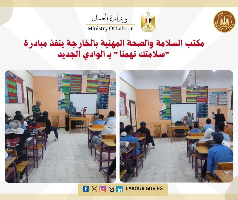 قام مكتب السلامة والصحة المهنية بالخارجة بتنفيذ مبادرة "سلامتك تهمنا" في المدرسة الثانوية الصناعية العسكرية بحضور 40 مشاركاً. وأشار اسامه ابراهيم مدير المديرية أن الندوة تهدف إلى النهوض بمستوى السلامة والصحة المهنية وتأمين بيئة العمل، والتوعية بأحكام الكتاب الرابع المتعلق بالسلامة والصحة المهنية من قانون العمل الجديد رقم 14 لسنة 2025.