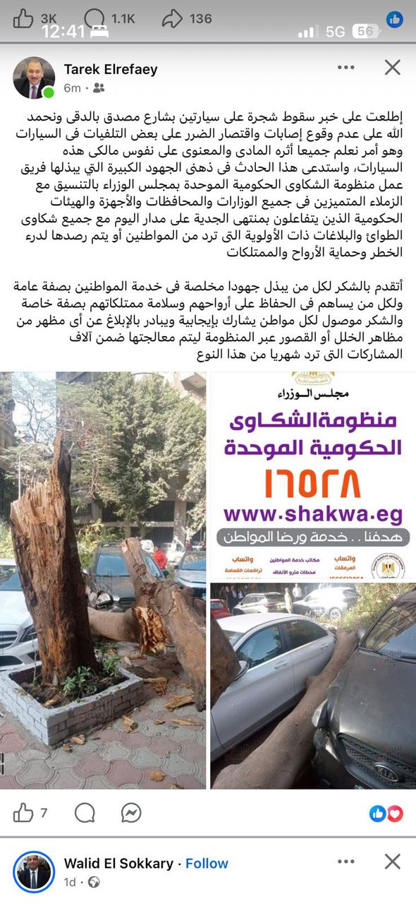 عقّب الدكتور طارق الرفاعي، مساعد الأمين العام لمجلس الوزراء لمنظومة الشكاوى ورضا المواطنين، على واقعة سقوط شجرة على سيارتين بشارع مصدق بالدقي، مؤكدًا أن الواقعة أعادت إلى الأذهان أهمية الجهود اليومية التي تبذلها منظومة الشكاوى الحكومية في التعامل السريع مع البلاغات الطارئة لحماية الأرواح والممتلكات.