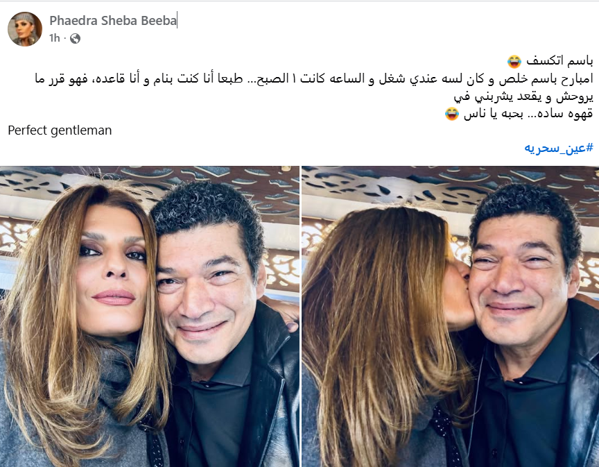 حيث علقت فيدرا على منشورها قائلة: "باسم اتكسف، امبارح باسم خلص و كان لسه عندي شغل و الساعه كانت 1 الصبح، طبعا أنا كنت بنام و أنا قاعده، فهو قرر ما يروحش و يقعد يشربني في قهوة سادة، بحبه يا ناس، الرجل المثالي".