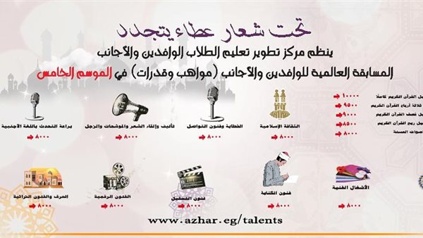 أعلن مركز تطوير تعليم الطلاب الوافدين والأجانب بالأزهر الشريف عن انطلاق الموسم الخامس من المسابقة العالمية للوافدين والأجانب: «مواهب وقدرات»، وهي أكبر مسابقة سنوية في الأزهر لاكتشاف ورعاية المواهب بين الطلاب الوافدين، ودعم طاقاتهم الإبداعية والفكرية في مختلف المجالات العلمية والدينية والثقافية والفنية التكنولوجية وغيرها.