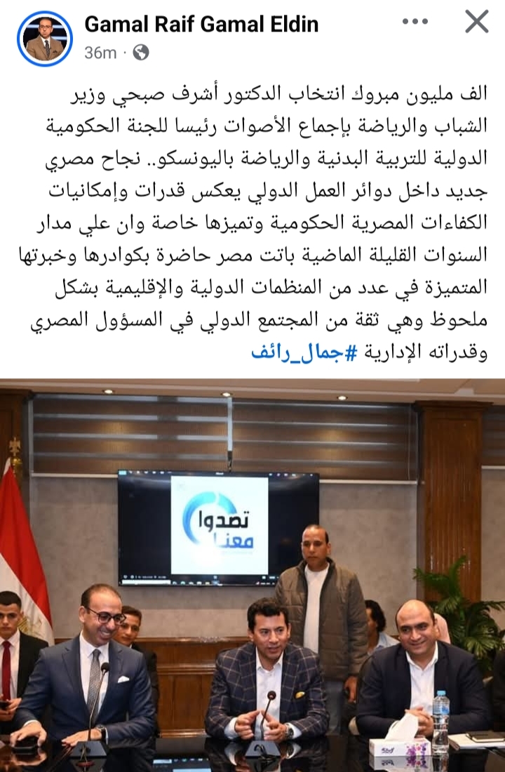 هنأ الكاتب الصحفي والمحلل السياسي جمال رائف الدكتور أشرف صبحي وزير الشباب والرياضة، على فوزه برئاسة اللجنة الحكومية الدولية للتربية البدنية والرياضة باليونسكو بإجماع الأصوات ليصبح أول مصري يتولى هذا المنصب الأممي البارز.