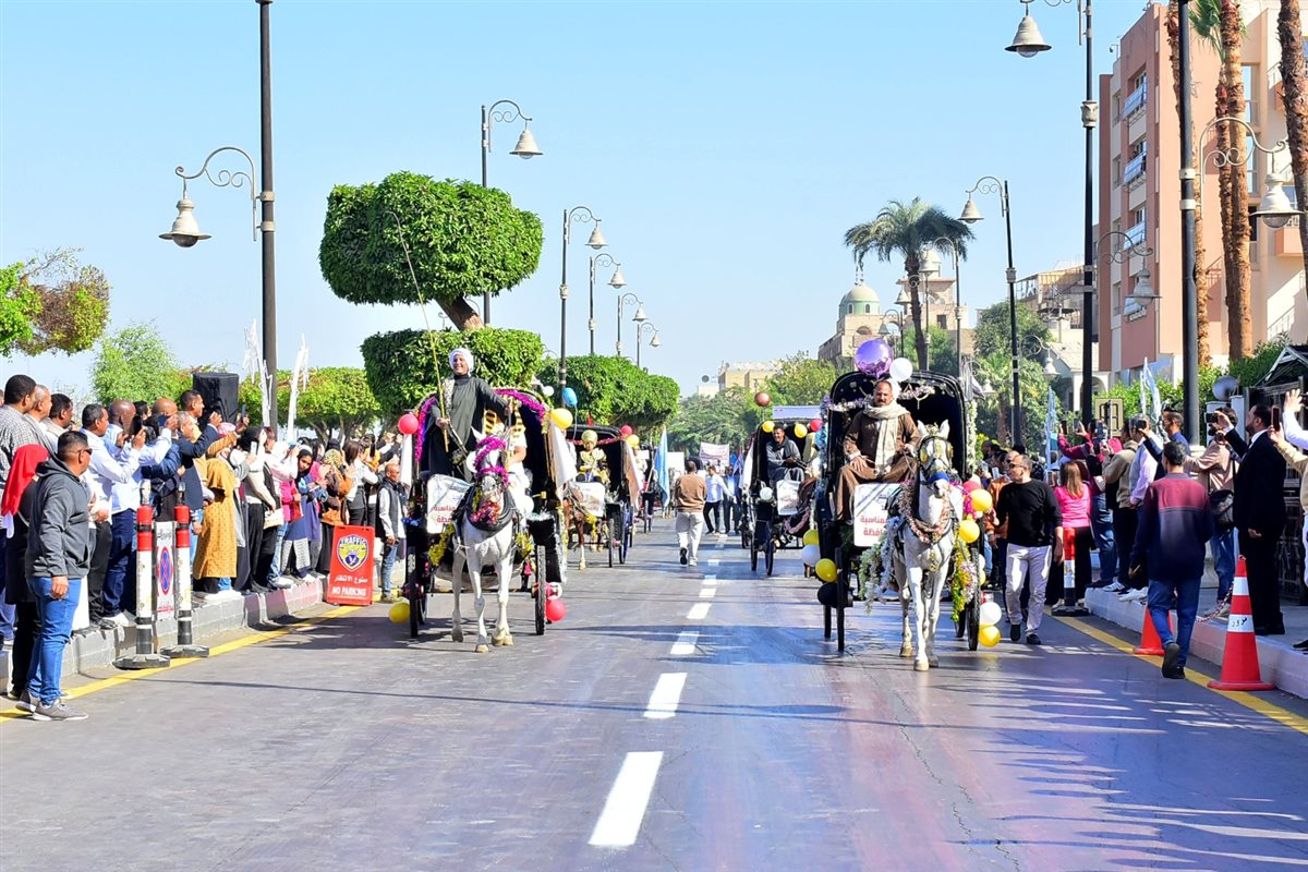 بدأت الاحتفالية بموكب عربيّات الحنطور المزينة، شارك فيها أطفال بملابس فرعونية وعاملون من القطاع السياحي، مقدّمين صورة جمالية تعبّر عن تراث الأقصر العريق. كما مرّ علم جمهورية مصر العربية بطول 25 مترًا في مشهد لافت، يتقدمه حملة الإعلام وعلم محافظة الأقصر.