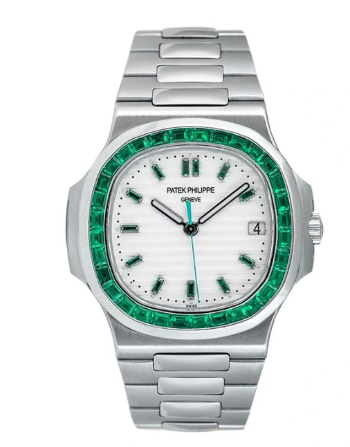 ساعة باتيك فيليب نوتيلوس 5711/1A المصنوعة من الفولاذ المقاوم للصدأ، تتميز بإطار مصمم خصيصا مرصع بزمرد أخضر، وميناء أبيض مصمم خصيصا بعلامات ساعات زمردية، وزجاج من الياقوت، وغطاء خلفي من الياقوت، وسوار فولاذي بمشبك مزدوج قابل للطي، وتعمل بآلية تعبئة ذاتية أوتوماتيكية مع خاصية عرض التاريخ.