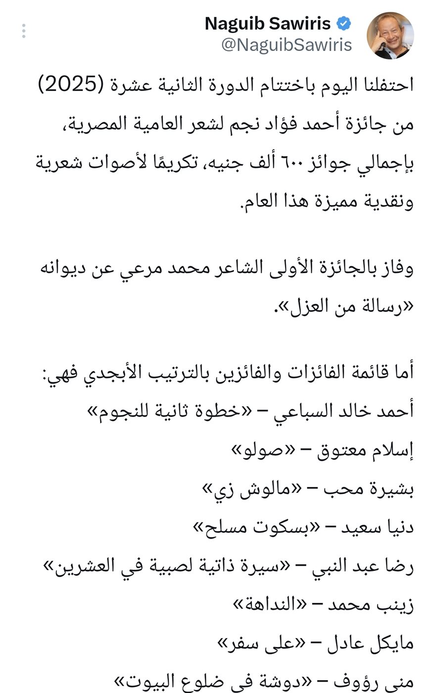 احتفل رجل الأعمال المهندس نجيب ساويرس باختتام فعاليات الدورة الثانية عشرة 2025 من جائزة أحمد فؤاد نجم لشعر العامية المصرية، والتي بلغ إجمالي قيمتها هذا العام 600 ألف جنيه، تكريمًا لمجموعة من أبرز الأصوات الشعرية والنقدية.