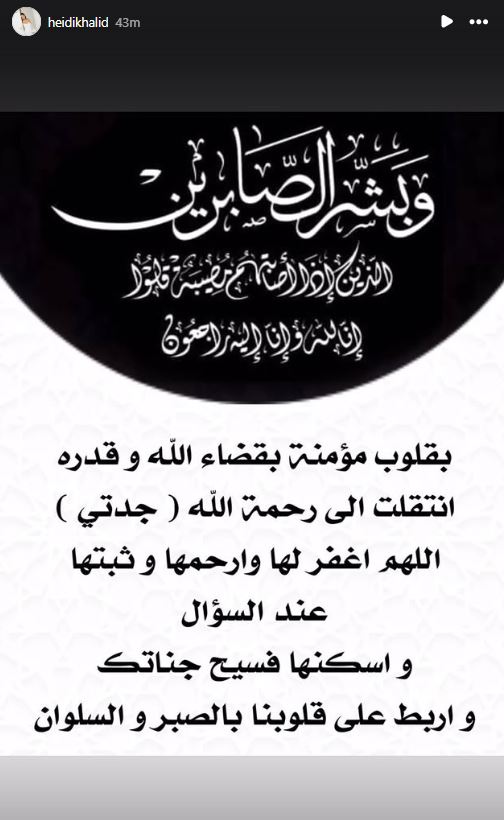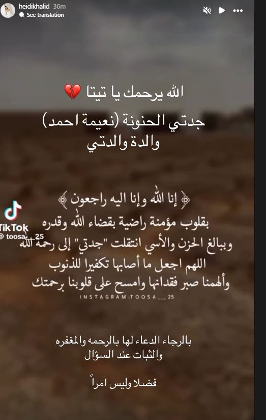 وقالت هايدي في الستوري:" الله يرحمك يا تيتا، جدتي الحنونة والدة والدتي".