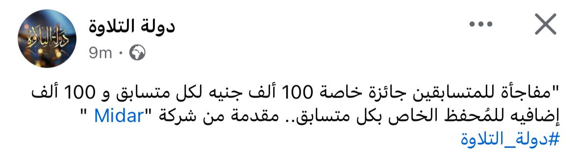 أعلنت الصفحة الرسمية لبرنامج «دولة التلاوة» عن تخصيص مجموعة من الجوائز الاستثنائية للمتسابقين، بقيمة 100 ألف جنيه لكل متسابق، إضافة إلى مبلغ مماثل يُمنح للمحفظ الخاص بكل متسابق، مقدمة من إحدى الشركات العقارية.
