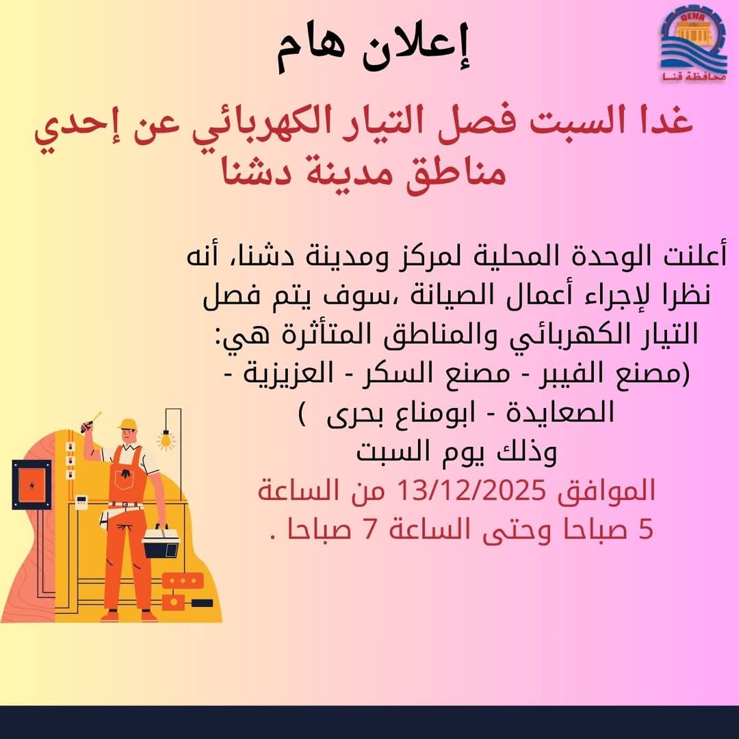 أعلن قطاع الكهرباء بالتنسيق مع الوحدة المحلية لمركز ومدينة دشنا، شمال محافظة قنا، عن تنفيذ أعمال الصيانة الدورية، ما يستلزم فصل التيار الكهربائي صباح غد السبت الموافق 13 ديسمبر 2025.