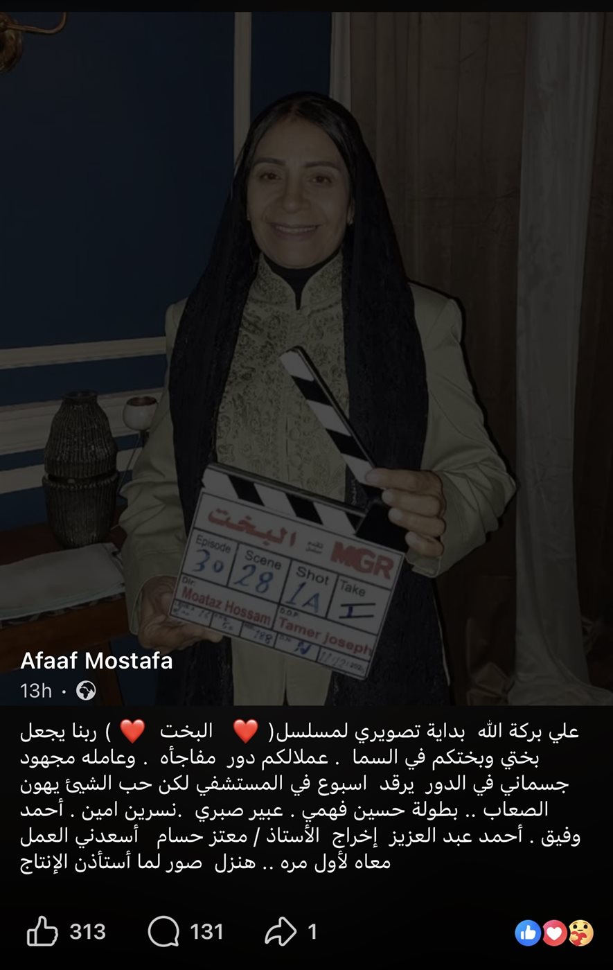 حيث قالت عفاف مصطفى في منشورها: “علي بركة اللّٰه بداية تصويري لمسلسل البخت، ربنا يجعل بختي وبختكم في السما، عملالكم دور مفاجأة، وعامل” مجهود جسماني في الدور يرقد اسبوع في المستشفي لكن حب الشيئ يهون الصعاب، المسلسل بطولة حسين فهمي، عبير صبري، نسرين امين، أحمد وفيق، أحمد عبد العزيز، إخراج الأستاذ / معتز حسام أسعدني العمل معاه لأول مرة هنزل صور لما أستأذن الإنتاج".