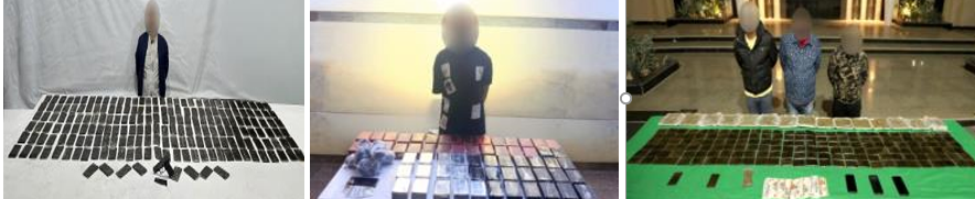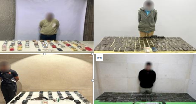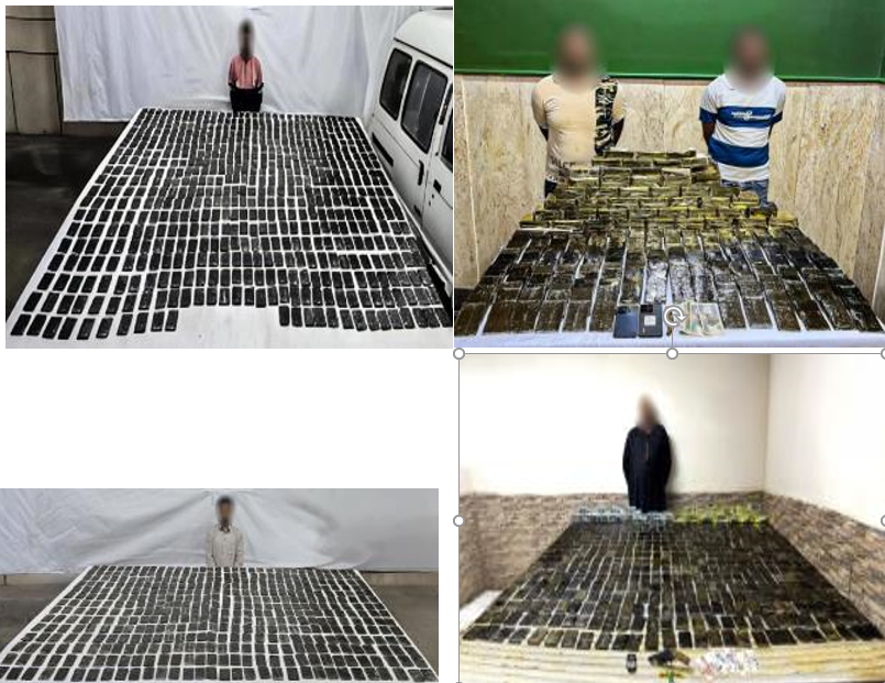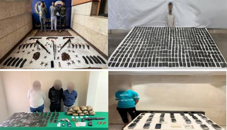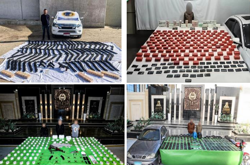 شملت المضبوطالت 725 كيلو جرام من المواد المخدرة المتنوعة (حشيش، هيدرو، شابو، هيروين)، 25 ألف قرص مخدر، 129 قطعة سلاح ناري (104 بندقية خرطوش، 3 بنادق آلية، 16 فرد خرطوش، 5 طبنجات، رشاش).