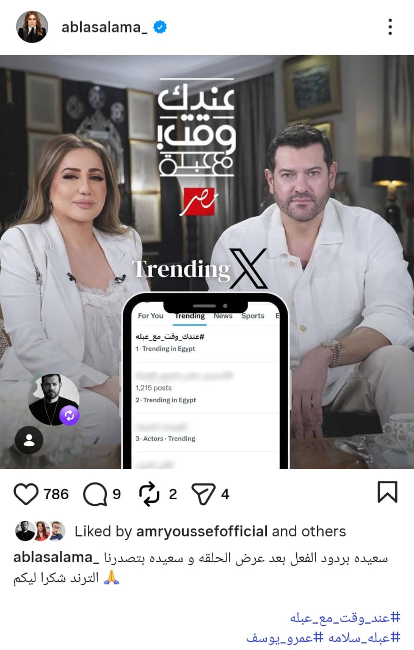 نشرت الإعلامية عبلة سلامة رسالة لجمهور برنامج عندك وقت مع عبلة عبر صفحات وسائل التواصل الاجتماعي الخاصة بها تشكرهم بعد تصدر حلقتها مع النجم عمرو يوسف تريند منصات التواصل الاجتماعي.
