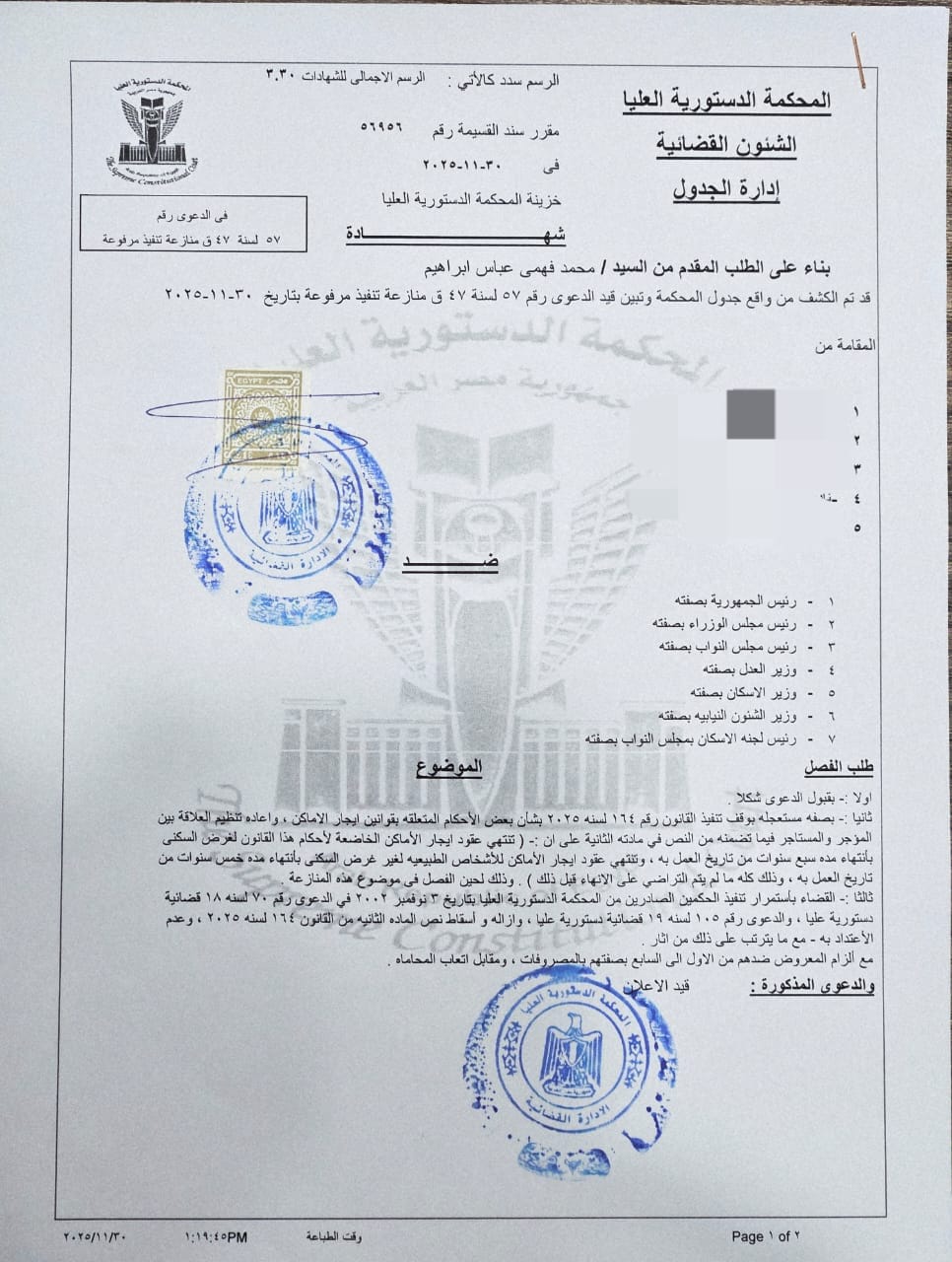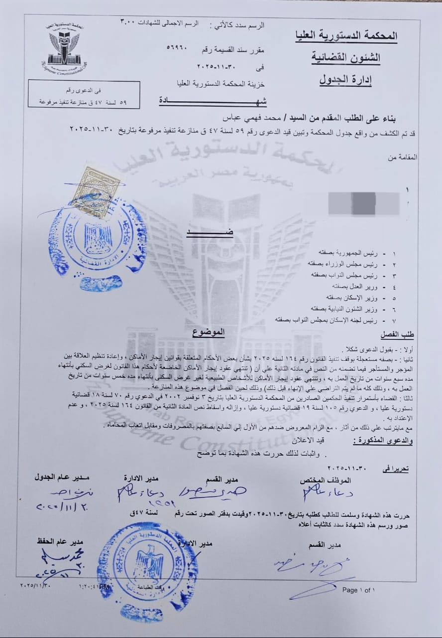أقام محمد فهمي عباس المحامي بالنقض، 3 منازعات تنفيذ خاصة لبعض المستأجرين ضد قانون الإيجار القديم، وتم إحالتها رسميًا للمفوضين لإعداد التقرير فيها.