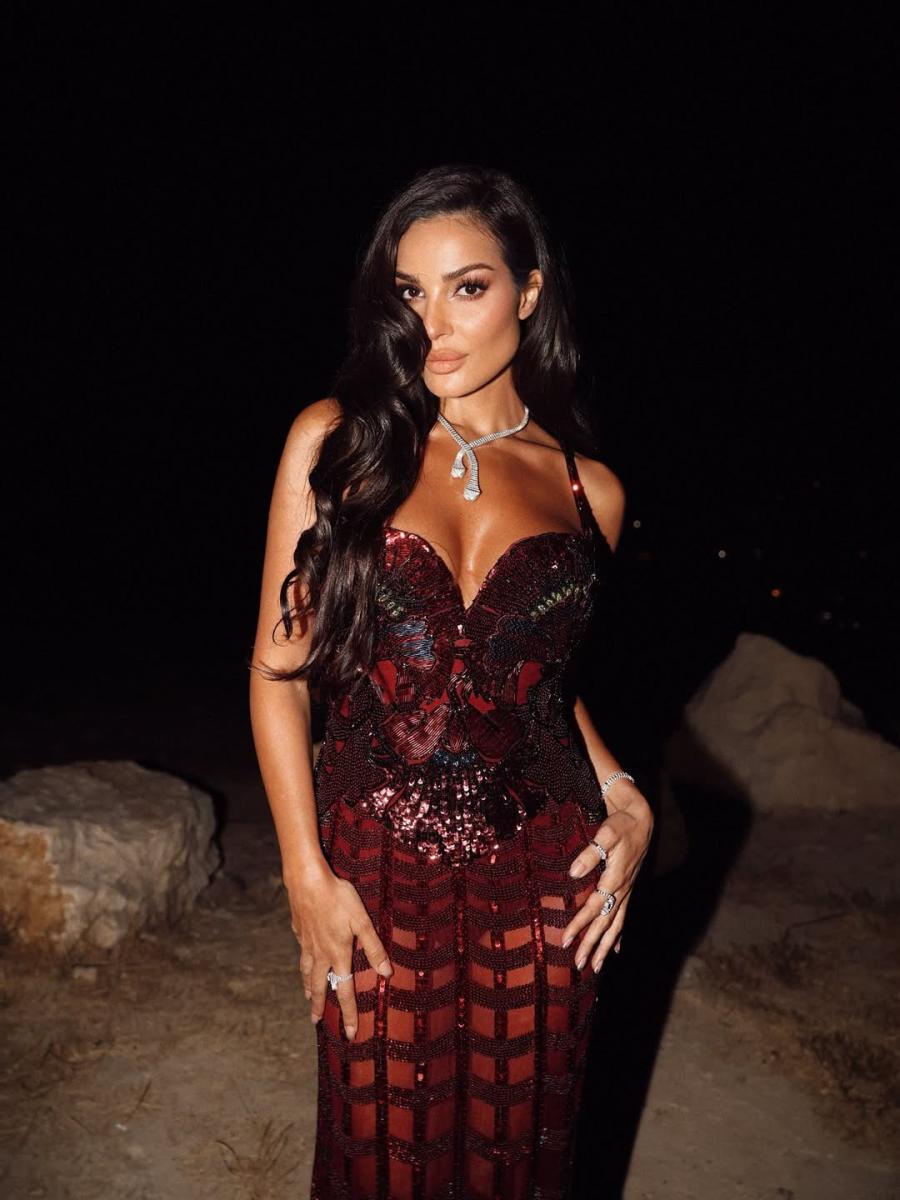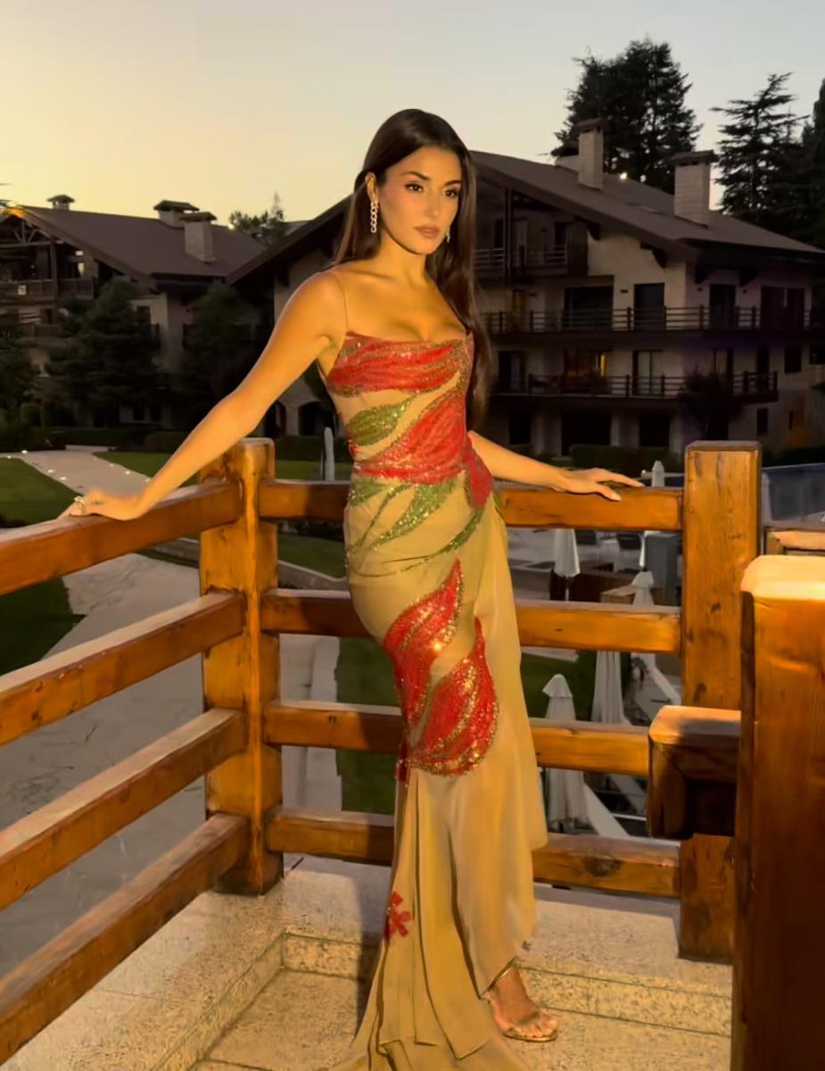 وفي واحدة من أبرز المفاجآت في السهرة، خطفت هاندا أرتشيل الأنظار بفستان ضيق طويل ذي حمالات رفيعة من مجموعة إيلي صعب لربيع 2023، يتميّز بقماش الترتر الفاخر والشيفون المزيّن بتطريزات ورود حمراء وأوراق خضراء أنيقة.