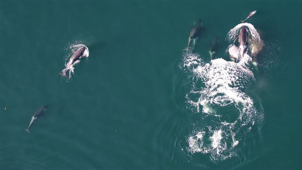 وتُظهر لقطات ال الحيتان القاتلة والدلافين تتحرك في تناغم، وتتغذى بالقرب من بعضها البعض، وربما تتقاسم الفرائس.