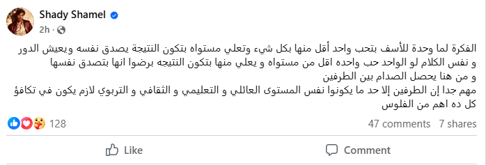 وقال شادي شامل في منشوره: “الفكرة لما واحدة للأسف بتحب واحد أقل منها بكل شيء، وتعلي مستواه بتكون النتيجة يصدق نفسه ويعيش الدور، و نفس الكلام لو الواحد حب واحدة أقل من مستواه و يعلي منها بتكون النتيجة برضوا أنها بتصدق نفسها، و من هنا يحصل الصدام بين الطرفين، مهم جدا إن الطرفين إلي حد ما يكونوا نفس المستوى العائلي و التعليمي و الثقافي و التربوي لازم يكون في تكافؤ، كل ده أهم من الفلوس”.