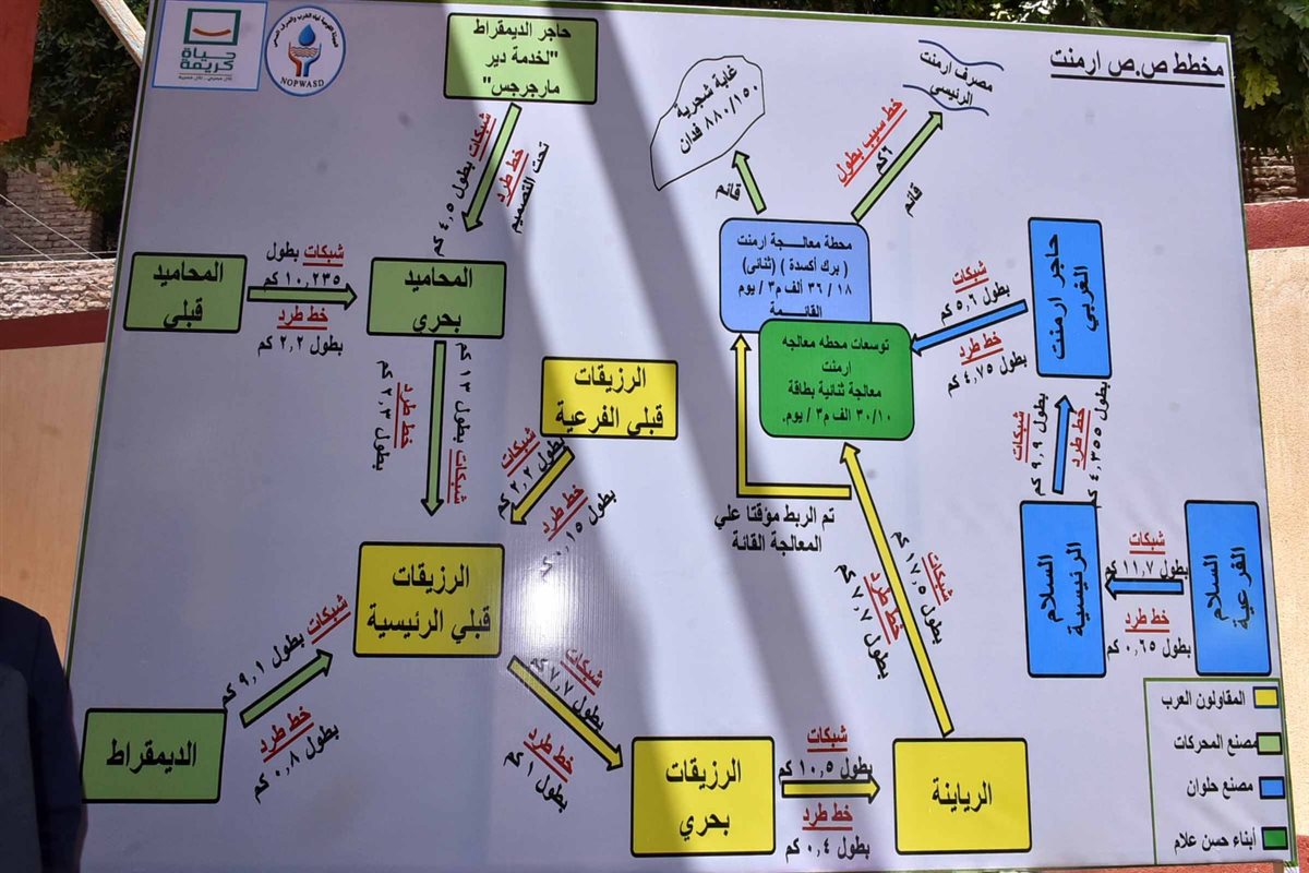 وشملت الأعمال الجارية استكمال محطة معالجة الحلة والدير بطاقة تتراوح بين 15 إلى 25 ألف متر مكعب يوميًا، إلى جانب وضع حجر الأساس لقرية الزنيقة والبدء في تنفيذ شبكات الانحدار بها.