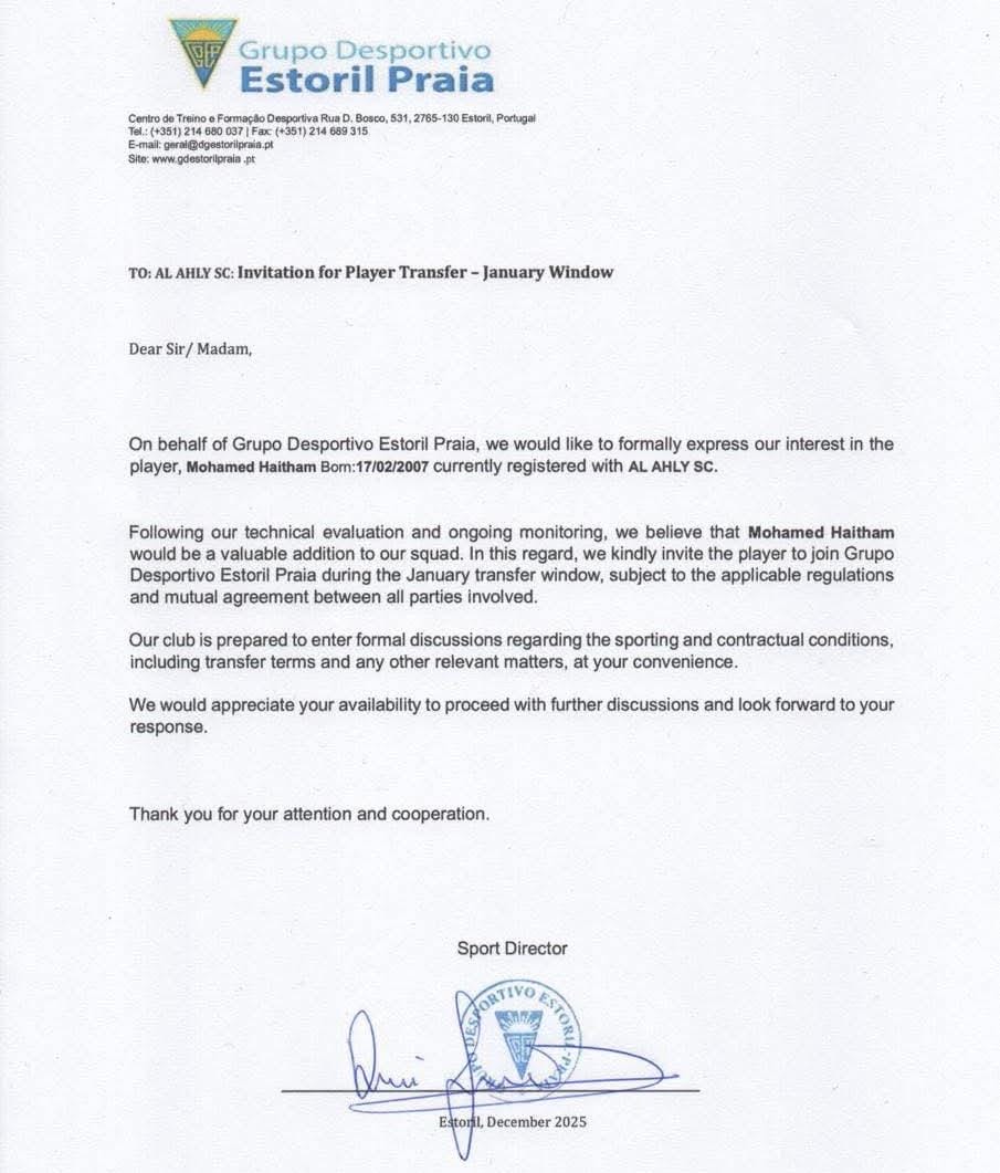 اقترب محمد هيثم لاعب فريق الأهلي مواليد 2007، من الإنتقال إلى فريق إشتوريل برايا البرتغالي خلال فترة الانتقالات الشتوية المقبلة.