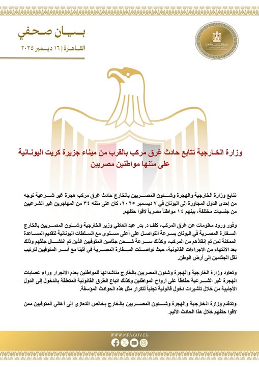 تتابع وزارة الخارجية والهجرة وشئون المصريين بالخارج حادث غرق مركب هجرة غير شرعية توجه من إحدى الدول المجاورة إلى اليونان في 7 ديسمبر 2025، كان على متنه 34 من المهاجرين غير الشرعيين من جنسيات مختلفة، بينهم 14 مواطنًا مصريًا لاقوا حتفهم.