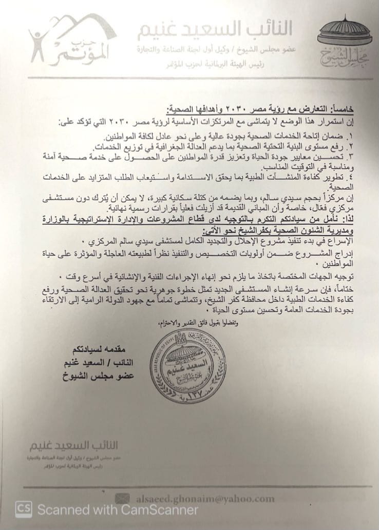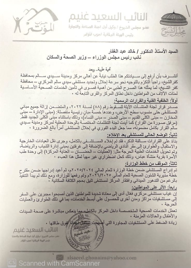 موافقة الصحة لهذا القرار يسهم في عودة الخدمات لأهالي سيدي سالم
