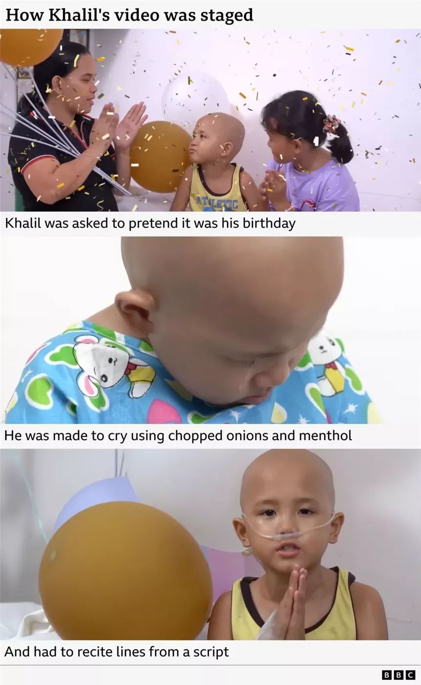 ورغم أن المشهد كان مفبركا، وافقت ألجين على المشاركة لأن خليل كان بالفعل يعاني من السرطان، حيث قيل لها إن الفيديو سيساعد في جمع تبرعات لعلاجه في مكان أفضل، وبالفعل تم جمع تبرعات بقيمة 27 ألف دولار ضمن حملة حملت اسم خليل، وفقًا لما توصل إليه التحقيق.