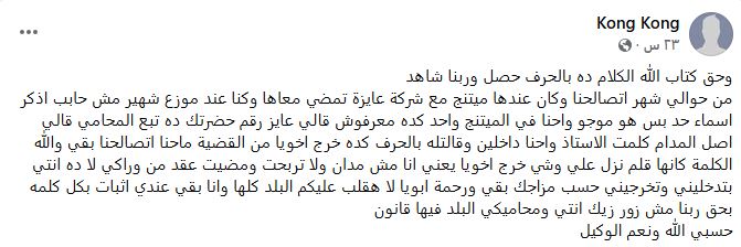 وفي منشور متتالي كتب موضحًا: «مانتي متعودة علي رمي البلا والافترى، عيشتك كلها زور في زور وصدقيني الشغل الشمال بتاعك انتي وانتوش ده مش هيطفي نارك كل ده عشان خسرتي القضية اللي انتي بردو رفعاها زور وربنا شاهد، وعالم بس البلد فيها قانون فوق راسك انتي وانتوش».