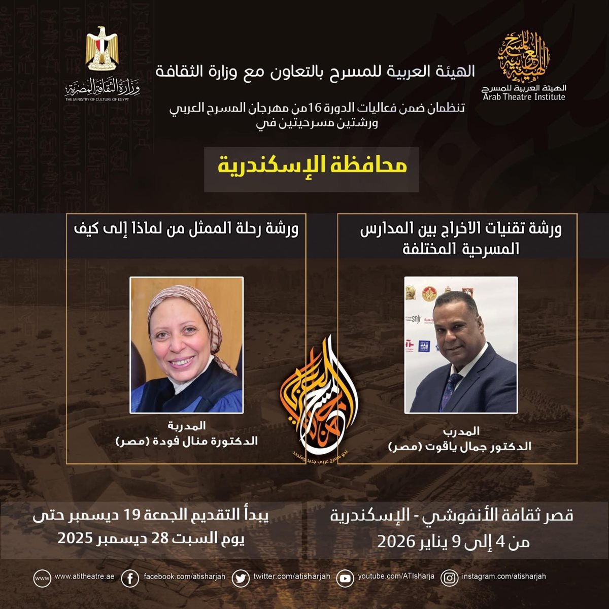 أما في الإسكندرية، فتستضيف ورشة تمثيل تقدمها الدكتورة منال فودة، وورشة إخراج يقدمها الدكتور جمال ياقوت، لتعزيز الحركة المسرحية في المدينة وتوفير فرص تدريبية متقدمة لشباب المسرحيين.